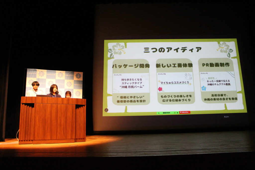 SDGsをテーマにORION COSMETICS様(沖縄県)と連携したプロジェクトです。このPBLでは「事前に準備した企画を企業に提案し、プロからのフィードバックを受け、改善を重ねて形にする」というビジネスさながらのプロセスに挑戦しました。事前に練り上げた企画を意気揚々と現地でプレゼンしたものの、「ターゲット層とずれている」という厳しいフィードバックを受け、メンバー全員がメンタルブレイクを起こす事態となりました。しかしながら再度自分たちと向き合い直し、最終的にエコ洗剤キットやパッケージ開発など、形に残る素晴らしい成果を生み出しました。さらに、この活動をきっかけに、参加した生徒の一人が自らの事業アイデアとして「マイプロジェクトアワード」へと昇華させ、現在も個人の活動を続けています。