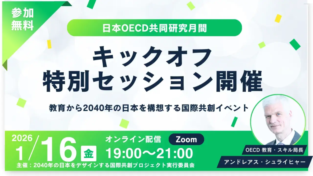 教育から2040年の日本を構想する国際共創イベントにOECD教育・スキル局長のシュライヒャー氏が登壇 2040年の日本をデザインする国際共創プロジェクト実行委員会は、「日本OECD共同研究月間」の開幕にあたり、オンラインイベント「キックオフ特別セッション...