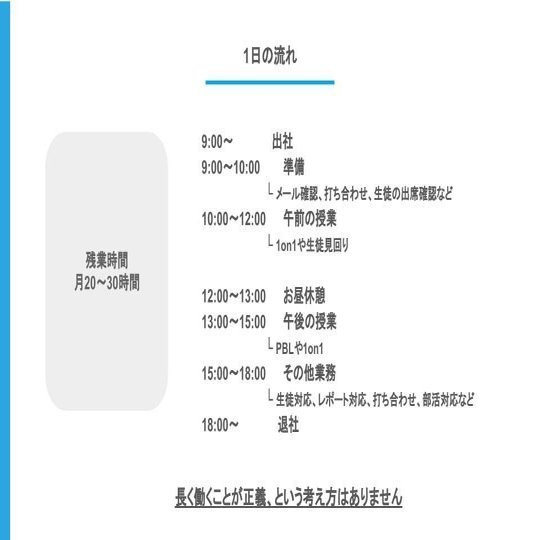 OECDの調査によると日本の教員は、世界一の長時間労働だと言われています。「過労死ライン」と言われる月80時間の残業時間を超える、96時間が平均残業時間。教員志望の学生が減っている理由としても「長時間労働など過酷な労働環境」が最大の要因となっています。