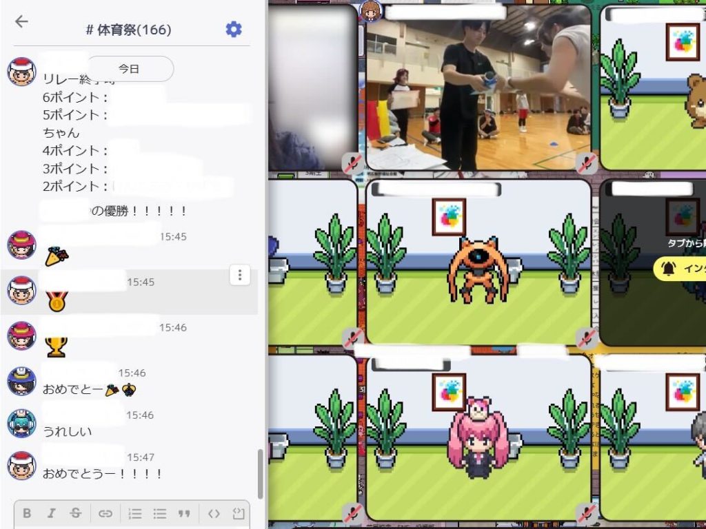 具体的には、体育祭の様子をライブ配信で繋ぎ、「勝敗予想大会」を実施。オンラインの生徒たちは、どのチームが勝つかを予想し、チャットでリアルタイムに応援メッセージを送り合いました。